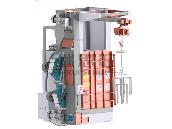 工件由吊钩载着进入抛丸室,利用高效抛丸器将弹丸高速抛射到被清理工件表面上,对工件进行清理,对于结构比较复杂的工件,可通过喷丸清除抛丸死角,来对工件进行彻底清理,达到除锈、强化的目的,适合于各种机械行业的中小型铸件、结构件的表面清理或强化处理。