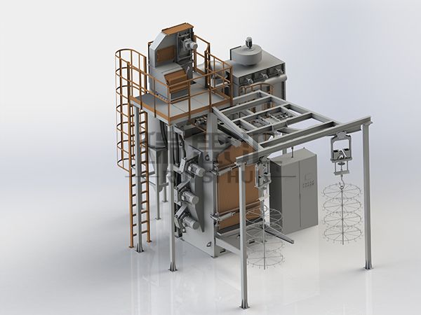 工件由吊钩载着进入抛丸室,利用高效抛丸器将弹丸高速抛射到被清理工件表面上,对工件进行清理,对于结构比较复杂的工件,可通过喷丸清除抛丸死角,来对工件进行彻底清理,达到除锈、强化的目的,适合于各种机械行业的中小型铸件、结构件的表面清理或强化处理。