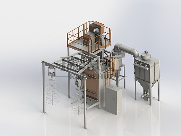 工件由吊钩载着进入抛丸室,利用高效抛丸器将弹丸高速抛射到被清理工件表面上,对工件进行清理,对于结构比较复杂的工件,可通过喷丸清除抛丸死角,来对工件进行彻底清理,达到除锈、强化的目的,适合于各种机械行业的中小型铸件、结构件的表面清理或强化处理。