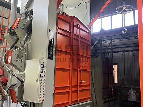 工件由吊钩载着进入抛丸室,利用高效抛丸器将弹丸高速抛射到被清理工件表面上,对工件进行清理,对于结构比较复杂的工件,可通过喷丸清除抛丸死角,来对工件进行彻底清理,达到除锈、强化的目的,适合于各种机械行业的中小型铸件、结构件的表面清理或强化处理。