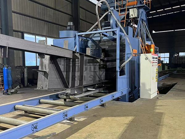 通过式抛丸清理机清理过程是由可调速的输送辊道将钢结构件或钢材送进清理机室体内抛射区其周身各面受到来自不同坐标方位的强力密集弹丸打击与磨擦,使之其上的氧化皮、锈层及其污物迅速脱落,钢材表面就获得一定粗糙度的光洁表面,在清理室外两边进出口辊道装卸工件。落入钢材上面的弹丸与锈尘经吹扫装置吹扫,撒落下来的丸尘混合物由回收螺旋输送到室体漏斗、纵横向螺旋输送机汇集于提升机下部再提升到机器上部的分离器里,分离后的纯净弹丸落入分离器料斗中内,供抛丸循环使用。抛丸清理中产生尘埃,由抽风管送向除尘系统,净化处理后的净气排放到大气中,颗粒状尘埃被捕捉收集。