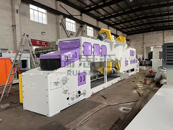 通过抛丸去除工件表面的锈层、焊渣及污物,使之获得均匀一致的金属光泽,提高了涂饰质量与防腐效果。被清理件以自动、连续不间断方式通过抛丸区,接受多个方向的抛丸清理,清理效果好,且有效避免工件相互碰撞而损伤。
